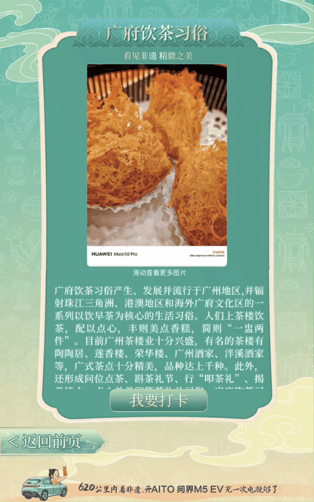 点击一个非遗技俩称号,便能获取该项见解图文先容,同期获取其线下非遗打卡点信息。