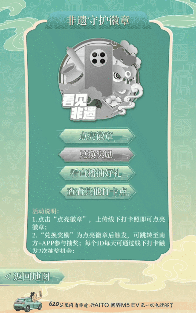国庆技术,去到率性线下打卡点拍照并上传像片,即可“点亮徽章”。线下打卡点包括17家非遗门店、省内50家华为门店以及13家汽车门店(具体参与门店信息可稽查“其他打卡点”)。