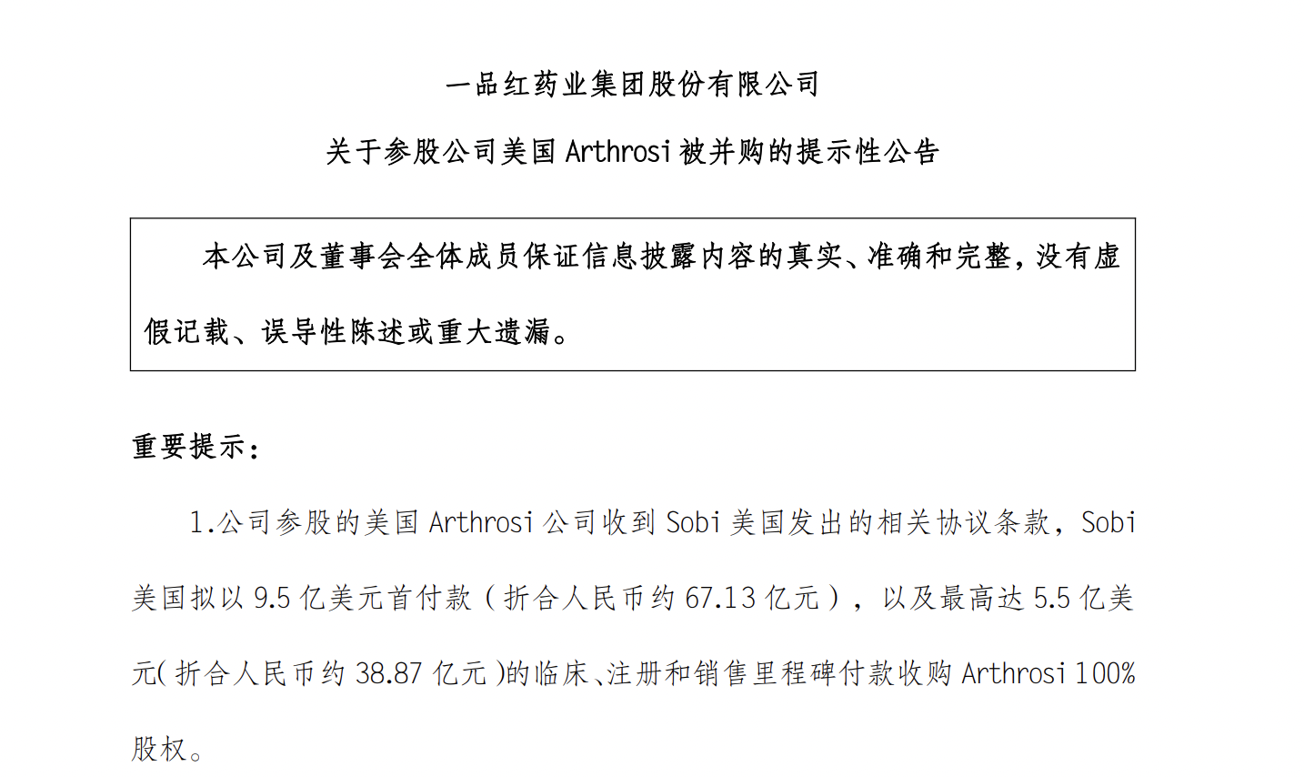 公告透露,公司参股的好意思国Arthrosi公司收到瑞典 Swedish Orphan Biovitrum AB 下属全资子公司Sobi好意思国发出的相干公约条目,Sobi好意思国拟以9.5亿好意思元首付款(折合东说念主民币约67.13亿元),以及最高达5.5亿好意思元(折合东说念主民币约38.87亿元)的临床、注册和销售里程碑付款收购Arthrosi 100%股权。